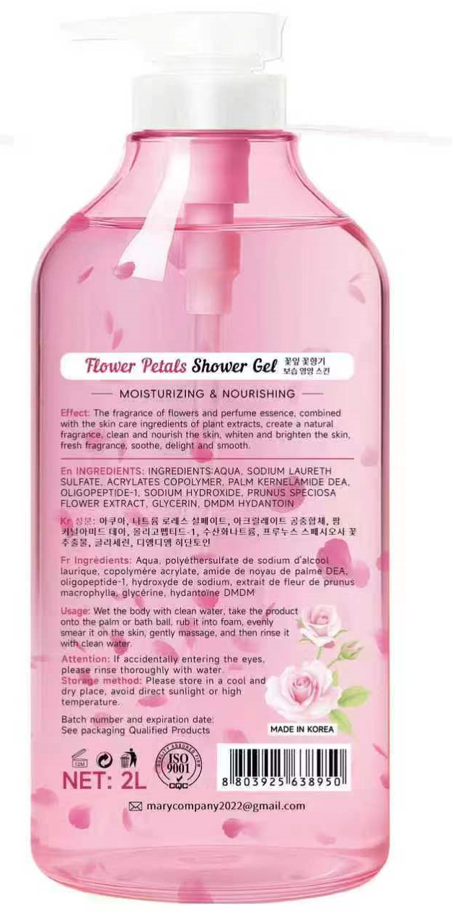 Aqua, Sodium Laureth Sulfate, Acrylates Copolymer, Palm kernelamide DEA, Oligopeptide-1, Sodium Hydroxide, Prunus Speciosa Flower Extract, Glycerin, DMDM Hydantoin.